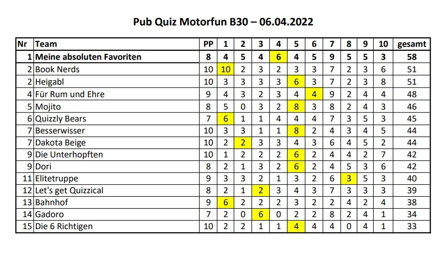 Den Gesamtstand in der Jahreswertung findest Du hier unter Locations. Das nächste Quiz im niederösterreichischen Heidenreichstein gibt es am 11. Mai! Wir freuen uns schon darauf!