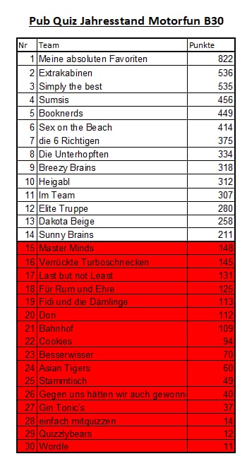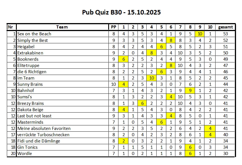 Was für ein Abend beim Quiz B30 Oktober! 20 Teams waren am Start – und am Ende gab’s eine echte Überraschung: Sex on the Beach holten sich nach jahrelanger Teilnahme endlich ihren ersten Sieg. Mit nur einem Punkt Vorsprung vor Simply the Best und Heigabel wurde’s richtig spannend bis zur letzten Frage.